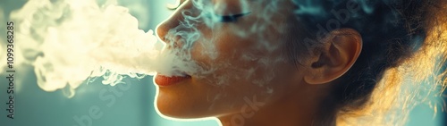 A serene portrait of a woman exhaling smoke, capturing a moment of tranquility and contemplation.