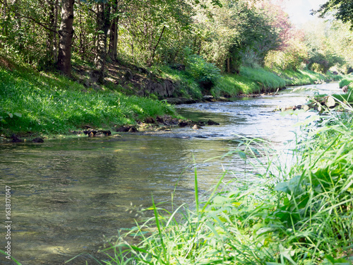 calmness, wilderness, ecosystem, flow, travel, wild, rural, flora, scenic, serene, sky, plant, lush, flowing, quiet, calm, fresh, green, river, stream, water, grass, tree, nature, landscape, greenery, sunlight, outdoors, bank, flowing water, clearwater, forest, vegetation, summer, scenery, environment, natural, peaceful, tranquil, idylli, wildlife, shore, riparian, aquatic, watercourse