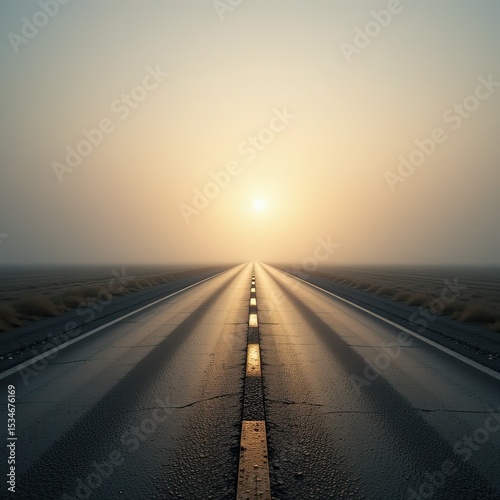 A serene road stretches into the horizon under a hazy sunset, evoking a sense of tranquility and adventure.