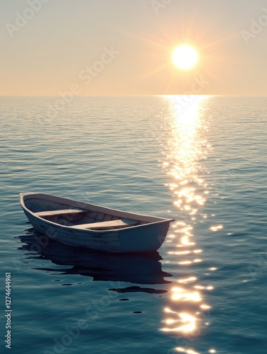 A serene scene of a white rowboat with oars, calmly floating in the stillness of early morning or late evening as the sun sets, evoking tranquility and solitude.
