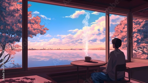 A serene scene of a young Asian man enjoying coffee with a beautiful lakeside view.
