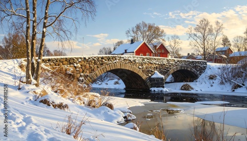 winter, snow, bridge, stone, river, tree, sky, cloud, house, red, architecture, landscape, nature, serene, peaceful, cold, frosty, icy, glacé, calm, water, scene, countryside, rural, beauty, calmness, stillness, quiet, frost, chill, bare, outdoors, scenic, picturesque, charming, idylli, pure, clean, crisp, snowy, path, ground, horizon