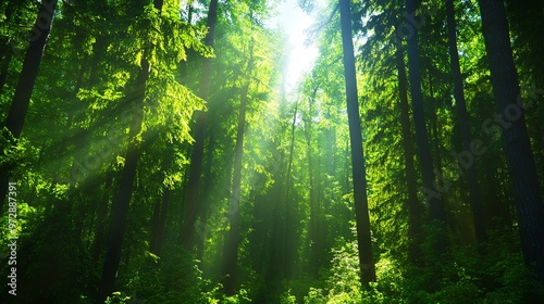 A serene sunlit forest scene showcasing vibrant greenery and peaceful atmosphere, perfect for nature lovers and relaxation.