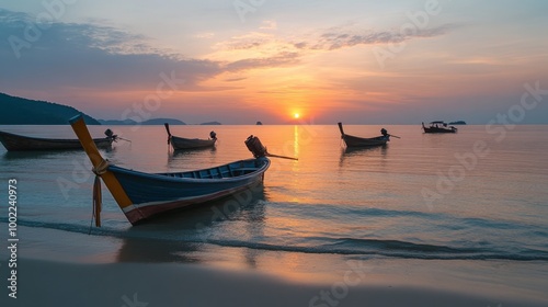 travel, sky, water, beach, seascape, morning, sea, outdoors, summer, horizontal, no people, photo, twilight, island, siam, tropical, boat, nature, relaxation, calmness, color image, sand, sunlight, travel destination, nautical vessel, southeast asia, tranquil scene, vacation, background, calm, idylli, scenery, wave, coastline, exotic, fishing