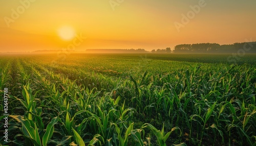 A serene sunrise over vast cornfields, with farmers diligently tending to their crops. The golden hues of dawn illuminate the greenery, promising a bountiful harvest.