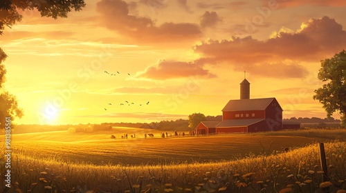A serene sunset over a vibrant farm, showcasing golden fields and a charming red barn, evoking peace and rural tranquility.