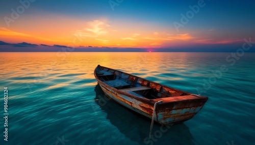 A serene sunset over calm waters with a solitary boat gently floating, creating a peaceful atmosphere for reflection.