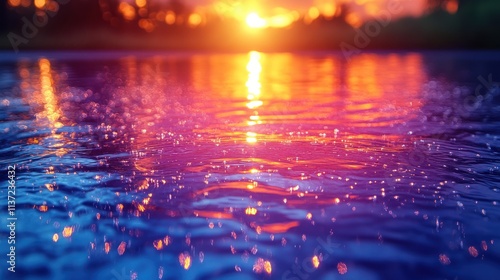 A serene sunset reflecting on water with raindrops creating ripples and vibrant colors.