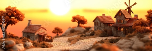 sunset, house, tree, path, landscape, nature, scenery, rural, peaceful, warm, sunlight, rock, architecture, village, windmill, environment, calmness, horizon, sky, rustic, evening, idylli, countryside, home, light, warmth, beauty, artistic, photo, charme, detail, foreground, background, colours, composition, visual, aesthetic, miniature, model, craftsmanship, serenity, atmosphere, harmony, design, scene, view, exploration, adventure