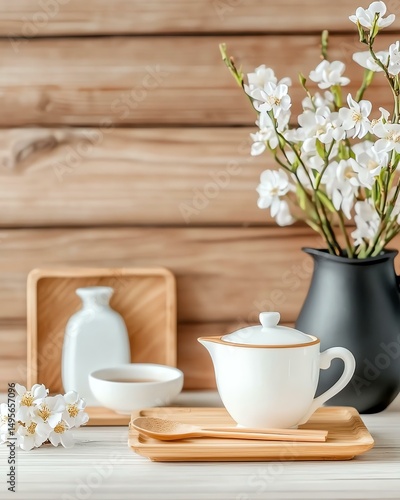 A serene tea setting featuring a teapot, cups, and elegant floral arrangements against a rustic wooden backdrop.