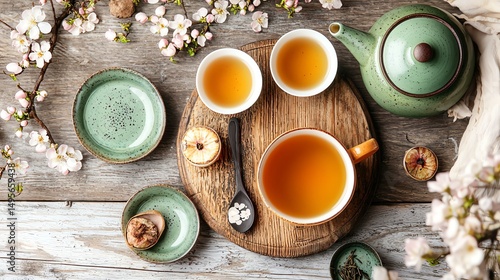 A serene tea setup featuring a teapot, cups, and delicate blossoms on rustic wooden background.