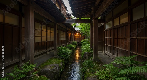 A serene, traditional Japanese alleyway lined with wooden buildings.