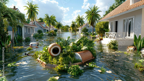 A serene tropical neighborhood flooded with water, palm trees swaying, and floating debris among submerged houses. Perfect for illustrating the impact of natural disasters and climate change.