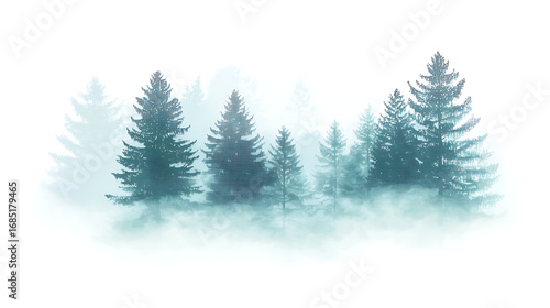 A serene view of an evergreen forest shrouded in a mysterious morning fog. A tranquil landscape of pine trees isolated on a white background