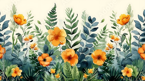 A serene watercolor pattern of a lush botanical garden, showcasing various botanical elements like ferns, leaves, and flowers, painted in soft, natural hues, seamlessly integrated with smooth transiti