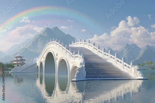 bridge, white, lake, mountain, rainbow, serene, peaceful, asian, tranquil, architecture, chinese, water, paved, stone, calm, misty, cloud, sky, sunrise, sunset, dreamlike, fantasy, digital, art, illustration, three-dimensional, view, nature, exterior, pavilion, temple, garden, landscape, decorative, ornamental, design, symmetry, geometric, still, beautiful, elegant, imagery, structure