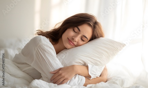 A serene woman peacefully sleeping on a large soft white pillow, hugging it gently, with a relaxed smile on her face