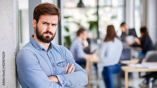 A serious Caucasian man with a beard stands in an office, arms crossed, focused on his work atmosphere.