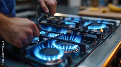 A service technician installs a gas stove in the kitchen using an electronic laser : Generative AI