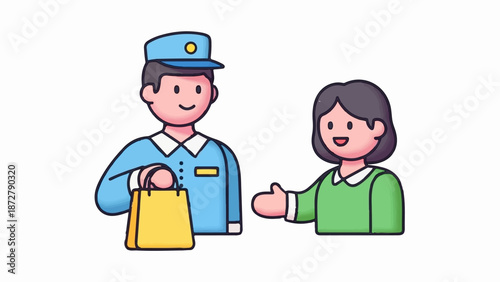 service, men at work, delivery, shopping, bag, giving, receiving, transaction, client, interaction, happy, smiling, friendly, person, character, cartoon, illustration, modern, simple, flat, icon, graphic, design, concept, help, assistance, retail, commerce, purchase, buy, sell, order, package, present, gift, good, item, exchange, partnership, collaboration, business, work, job, occupation, professional, uniform, cap, yellow, blue