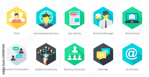 A set of 10 Communication icons as team, international business, user details