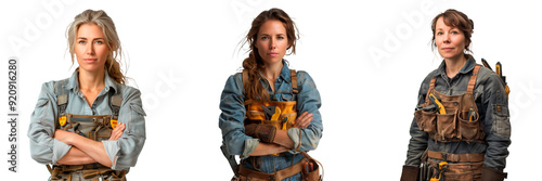 A set of American woman furniture assembler isolated on white or transparent background. Close-up of furniture assembler in special uniform with tools.