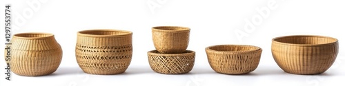 A set of bamboo baskets in different shapes and sizes, with a white background