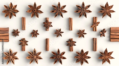 A set of cinnamon sticks and star anise seeds, viewed from above on a white background
