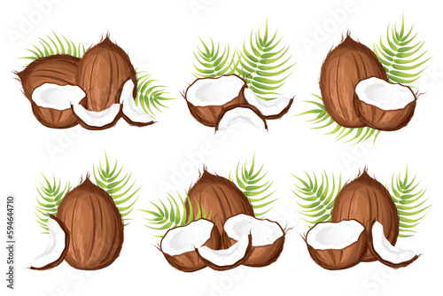 A set of coconuts.Coconut whole, half.Vector illustration of tropical coconut fruits with palm leaves.