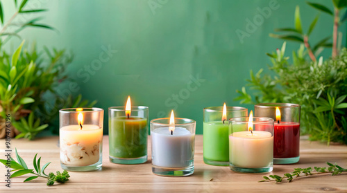A set of colorful scented candles in glass holders, surrounded by fresh green plants, offering a peaceful and natural vibe.