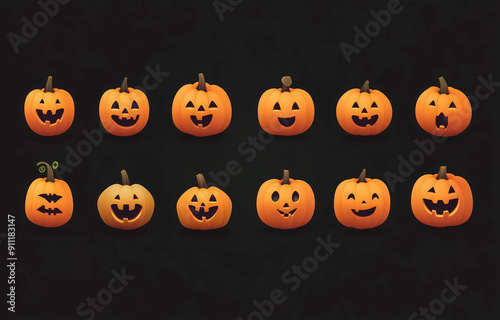 A set of cute Halloween pumpkins, with different expressions and happy faces, arranged in rows on a background