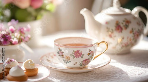 A set of delicate, gold-rimmed teacups and a porcelain teapot adorned with a floral pattern, set for afternoon tea with fours, refined and graceful, bright and airy photography.