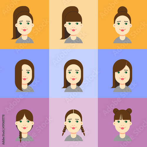 A set of female faces with different hairstyles. Vector illustration of a brunette head in flat design.