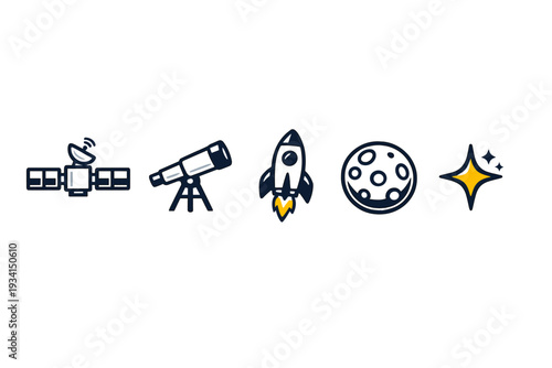 space, icon, satellite, telescope, rocket, moon, star, astronomy, science, vector, set, exploration, cosmos, universe, technology, planet, celestial, galaxy, minimalist, flat, design, illustration, graphic, symbol, collection, simple, modern, linear, outline, yellow, black, background, element, launch, orbit