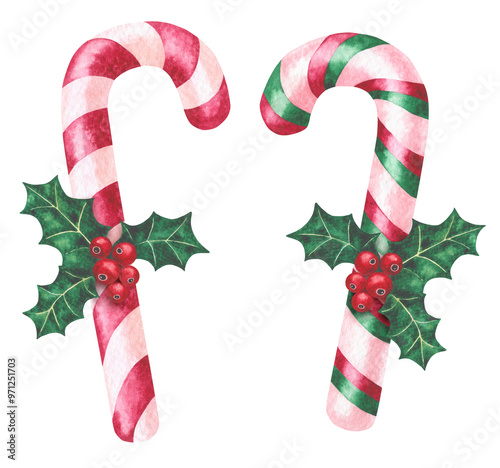 A set of hand-drawn Christmas watercolor illustrations of candy canes. Christmas sweets decorated with a sprig of holly. Perfect for cozy holiday decor.