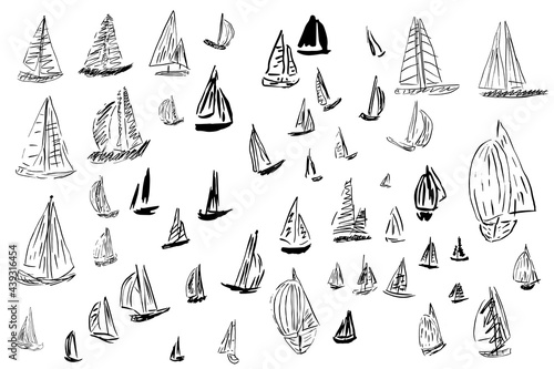 A set of images of yachts, sailing boats drawn by hand in a simple style. Vector illustration.