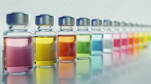 A set of laboratory vials with different colored substances, neatly lined up on a white surface