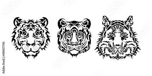 A set of lions faces consisting of patterns. Tiger head print. For T-shirts, phone cases and cups. Vector illustration.