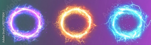 A set of magical electric balls, a lightning circle strike location, and a sphere isolate on a dark background