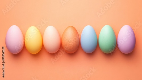 A set of matte-finished eggs in soft pastel hues neatly arranged on a warm peach background.