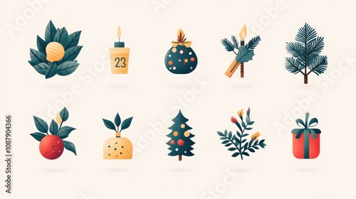 A set of nine Christmas icons, including a candle, a Christmas tree, a gift, and a holly sprig.
