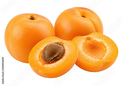 apricot, fruit, ripe, half, whole, juicy, fresh, tropical, sweet, organic, isolated, transparent, background, yellow, orange, pit, seed, cut, sliced, healthy, nourishment, snack, ingredient, raw, edible, botanical, dessert, summer, natural, vegetarian, delicious