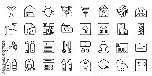 A set of simple, black line icons depicting a variety of business, technology, and general concepts