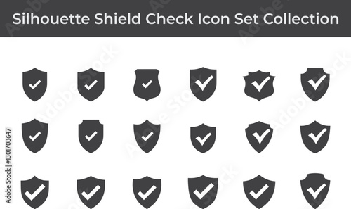 A set of simple black various shield check silhouette design icon vector logo illustrations isolated on white background