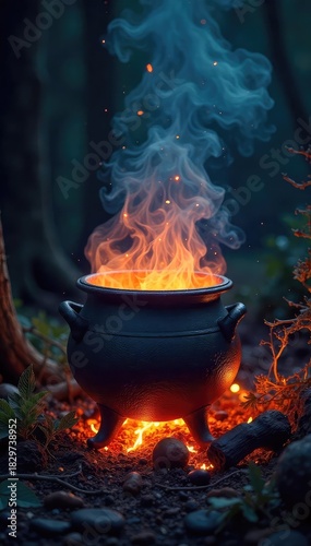 A shadowy cauldron bubbles ominously over a crackling fire, surrounded by eerie glowing herbs and strange artifacts, hinting at powerful, dark magic brewing in the night , brew, spooky