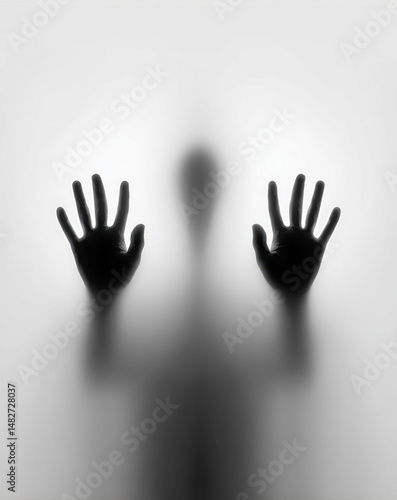 A shadowy figure with hands pressed against a translucent surface, creating an eerie and mysterious effect.