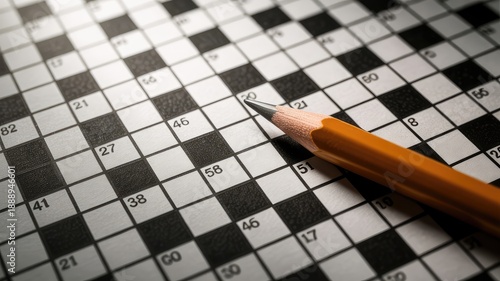 A sharp wooden pencil tip rests on a challenging black and white crossword puzzle under focused dram