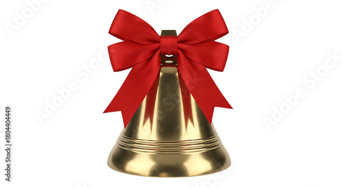 A shiny golden christmas bell adorned with a vibrant red velvet bow isolated on transparent background