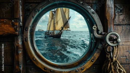 a ship's porthole, revealing an old sailing boat with people on board against a backdrop of dark brown wooden boards, evoking a sense of maritime adventure and tradition.