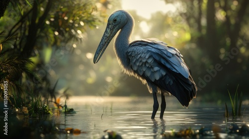 A shoebill stork standing still in shallow water, its massive beak highlighted by the sunlight.